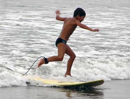 Koko perheen yhteiseksi ykköskiinnostuksen kohteeksi nousi surffaus. Se on näissä olosuhteissa ihan ymmärrettävää, kun isot aallot ilman pyörteitä lyövät suoraan matalaan hiekkarantaan. Ihanteellista juuri surffaukseen. Otimme ensin pari opetustuntia rannalla surffilautoja vuokraavilta pojilta. Täällä on kyllä runsaasti virallisiakin surffikouluja, mutta hinnat ovat toista luokkaa ja opetus suurinpiirtein samanlaista. Tunnin opetus lautoineen kahdella opettajalla maksoi rannalla koko perheeltä 20 dollaria.