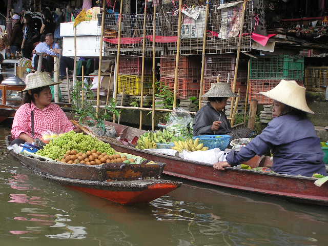 Yhden päivän retkikohteemme oli Bangkokin ulkopuolella sijaitsevat kelluvat markkinat, joista kuva yllä. Siellä myydään kaikenlaista syötävää ja muutakin tavaraa veneistä, kuten ennen on ollut yleisemminkin tapana. Nykyään nämä ovat muodostuneet turisteille suunnatuksi näytökseksi, joissa hinnatkin ovat omaa luokkaasa. Matka sinne veneellä pieniä kanaaleja pitkin oli kuitenkin kerrassaan ihastuttava, oli mukavaa seurata ihmisten elämää joen varressa, kuinka siellä kylvetään, pestään astioita tai nautitaan aamuateriaa.