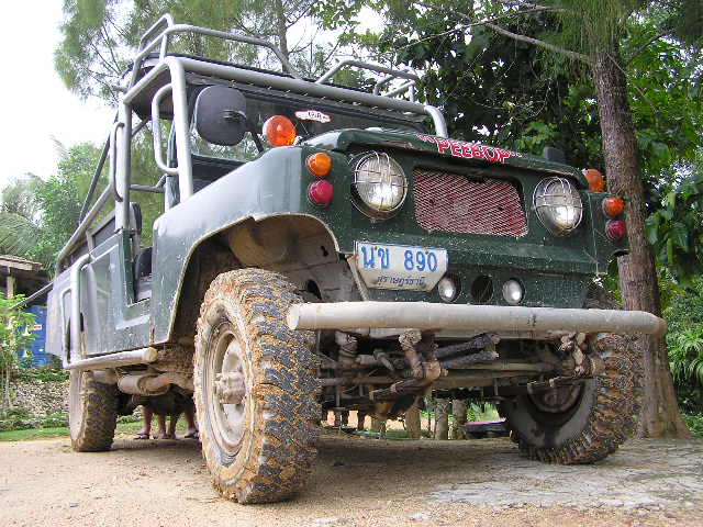 Jeeppisafari alkaa aamulla 8:30 kuten lähes kaikki mutkin retket. Minua tullaan noutamaan hotellilta Jeepillämme, vaikka sanontana vakiintuneempi "Jeeppi" onkin täällä Nissanin armeijamallinen maastolava-auto ja kolonnaamme kuuluvissa kolmessa autossa on 4-5 henkilöä kussakin. Autoissa on kolmen litran bensa ja yhdessä diesel moottori, meillä bensa. Meno on väkevää ja vaihteistoa tai nelivetovälityksiäkään ei ole liiemmälti synkronoitu, joten mukavin rusahduksin ja metelin saattelemana matkamme alkaa siirtymällä saaren keskiosaan, viidakkoon ja vuoren juurelle (saaren ympärysmitta 60 km).