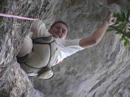 Osallistuin Krabin edustalla olevalla Ao Railay saarella Cliffs Man järjestämlle aloittelijan kurssille (n. 17eur). Minut haetaan aamulla 8:30 hotelliltamme, viedään veneellä saarelle (matka kestää tunnin). Kurssille osallistuu minun lisäkseni viisi Kanadalaista, kävelemme kiipeilyfirman pihaan missä iloinen rastatukkainen Thaimies - firman omistaja ottaa meidät vastan ja alkaa jakamaan turvavaljaita, tossuja ja magneessiumpusseja. Kengät tulee olla numeroa liian pienet ja varpaat ovat tiukoilla, tossujen pohjat on eritäin pitävää raakakumia. Valjaat kiinnitetään reisien ja vyötärön ympäri pujoittamalla - kiinnityskohta on etupuolella. Magneessiumpussi tulee selkäpuolelle, josta yllättäen oli kovasti hyötyä käsien hikoillessa ja pidon näin kadotessa. Siirryimme aivan lähellä olevalle n. 60 m korkean vuorenseinämän juurelle. Meille opetetaan muutamia turvallisuusasioita ja niistä tärkeimpänä tekemään tuplakasisolmu hengenpitimiksi.